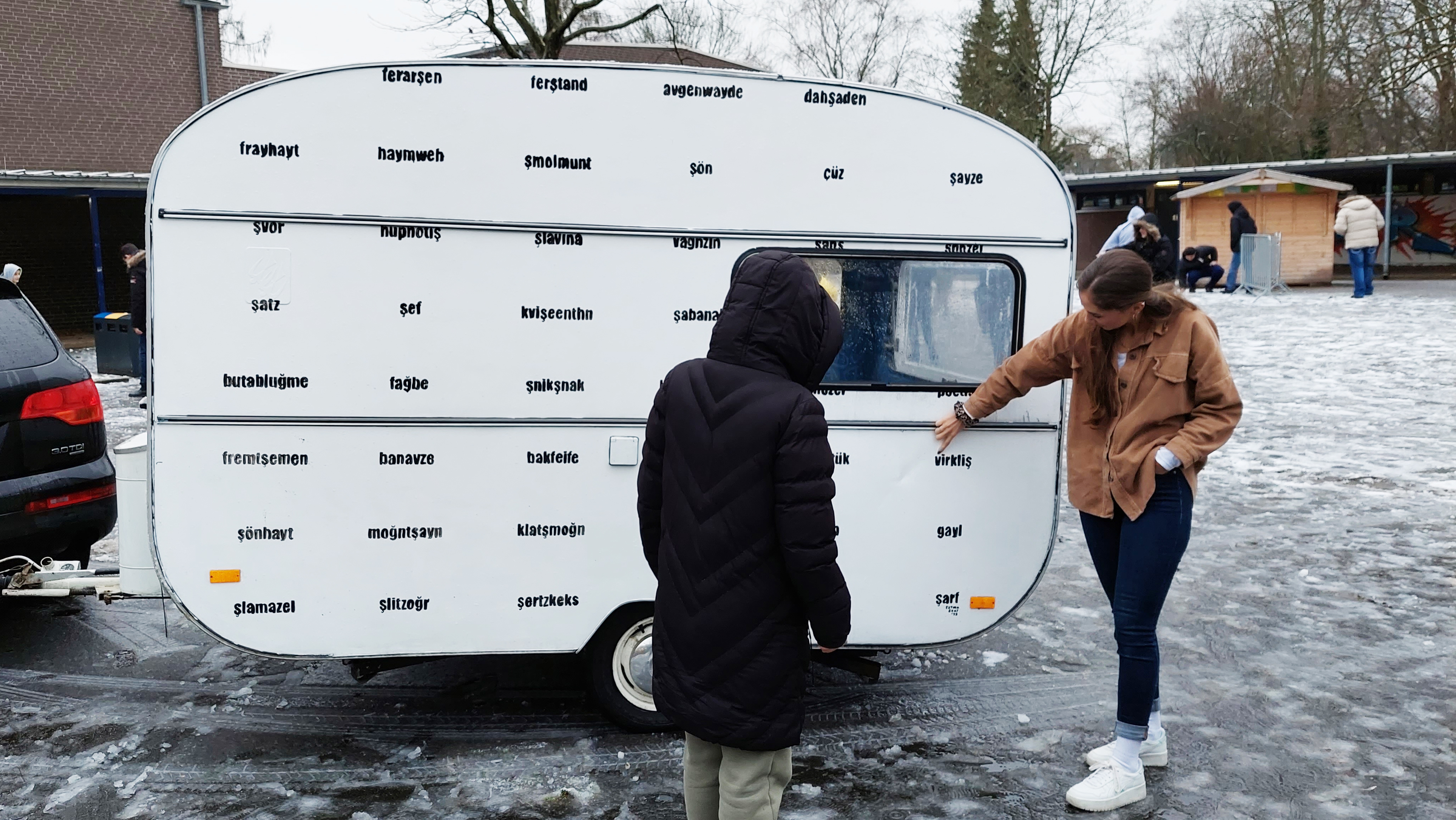 Mit einem Wohnwagen – gestaltet mit deutschen Wörtern, geschrieben in türkischer Schriftsprache,