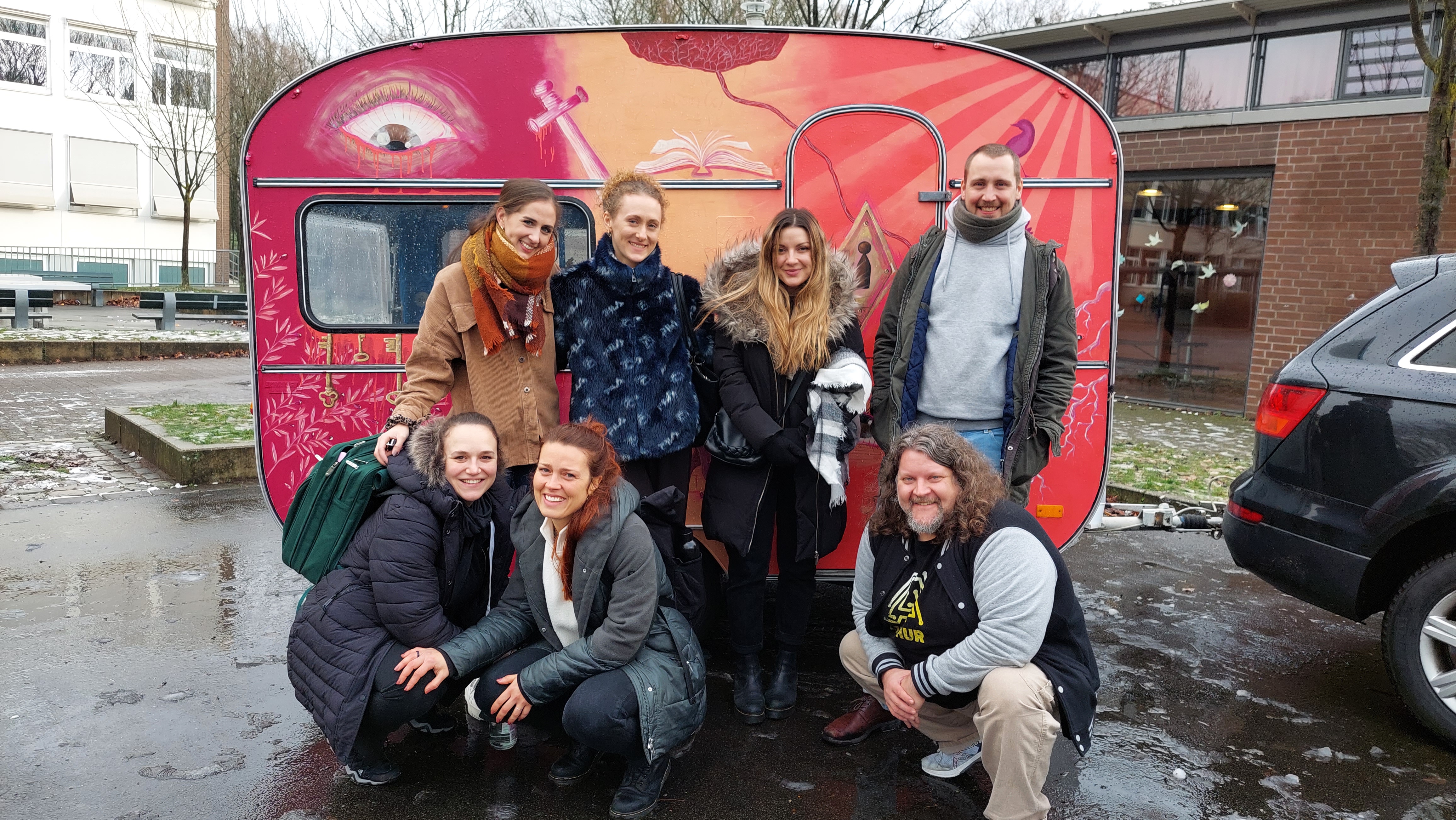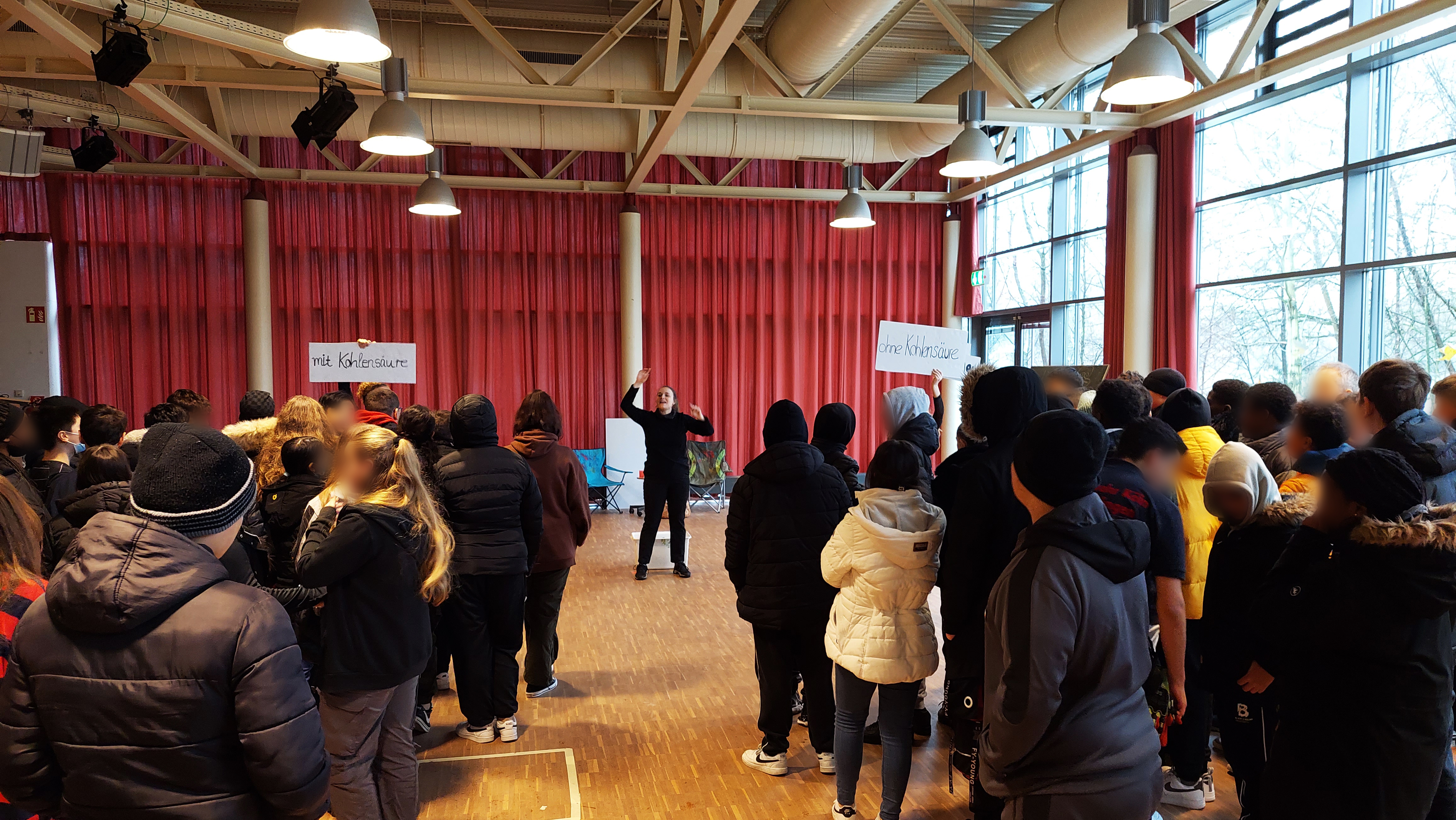 fuhren die Schauspieler*innen auf den Schulhof und luden die Schüler*innen im Pädagogischen Zentrum (PZ) zu einer etwas anderen, interaktiven Theater-Aufführung ein.