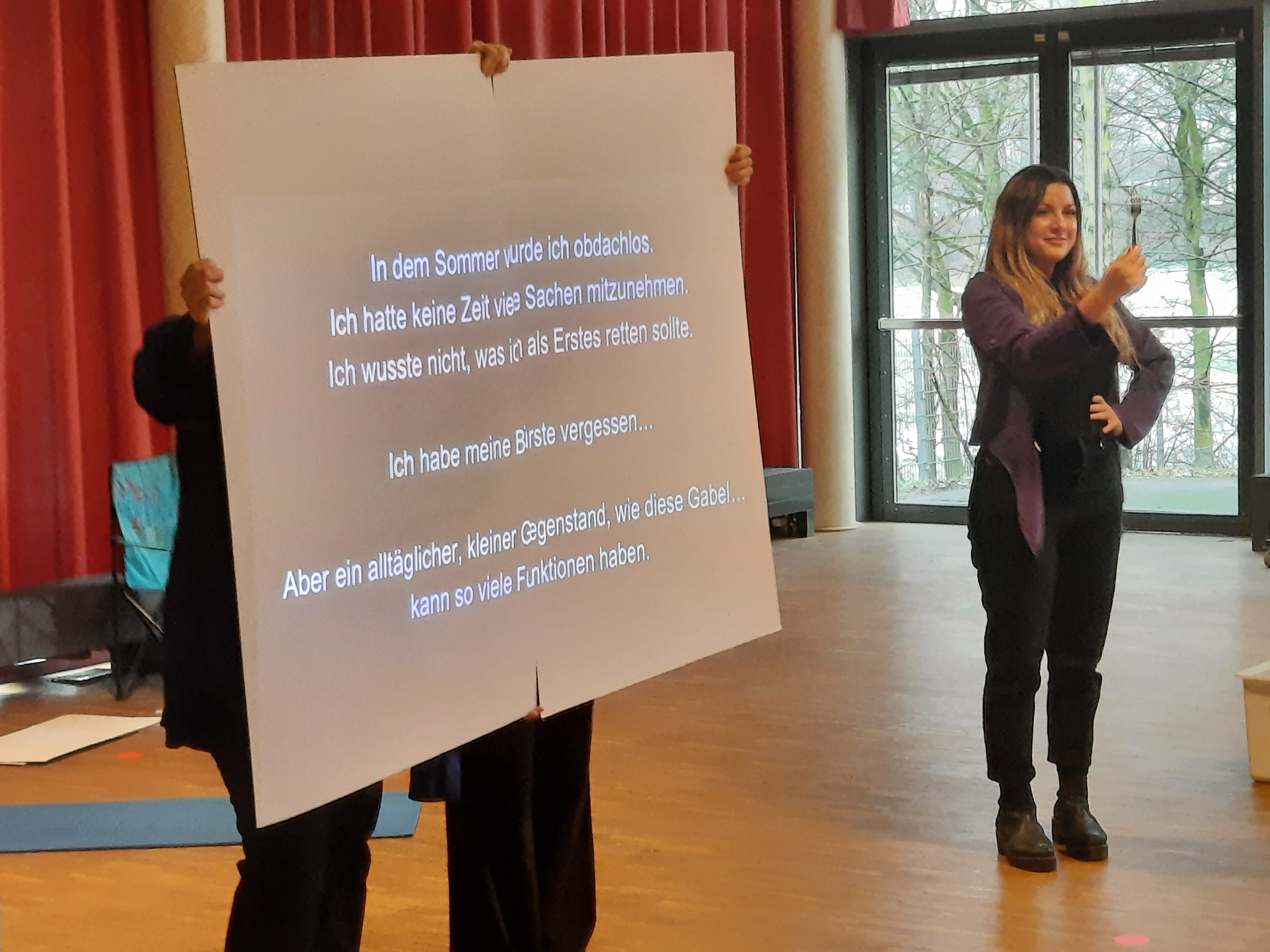 Diashows im Hintergrund, körperliche Darstellungen durch die Schauspieler:innen oder Teilübersetzungen mit eingebaut.