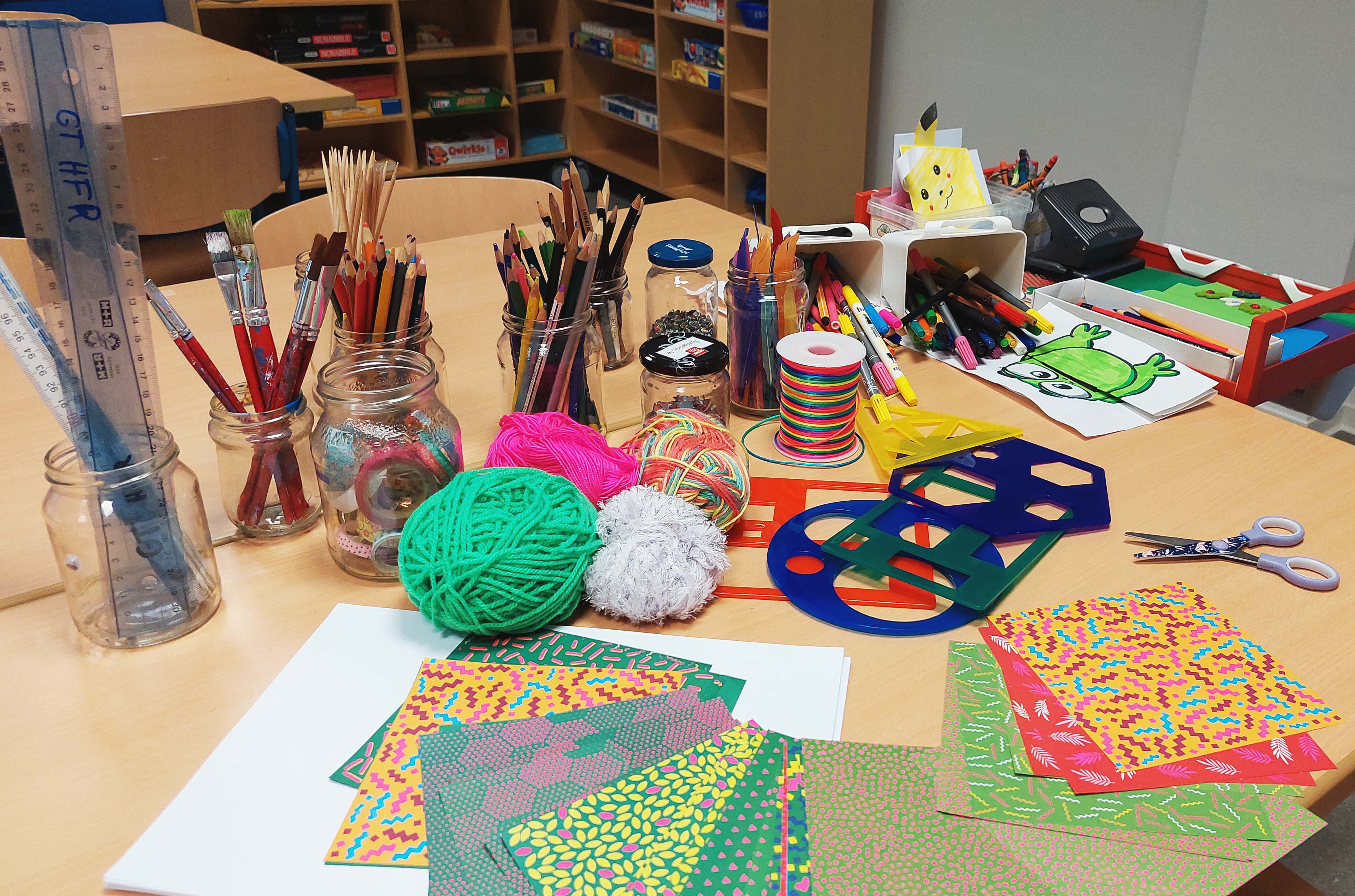Im Ganztagscontainer, Raum E001 stehen diverse Kreativmaterialien bereit,