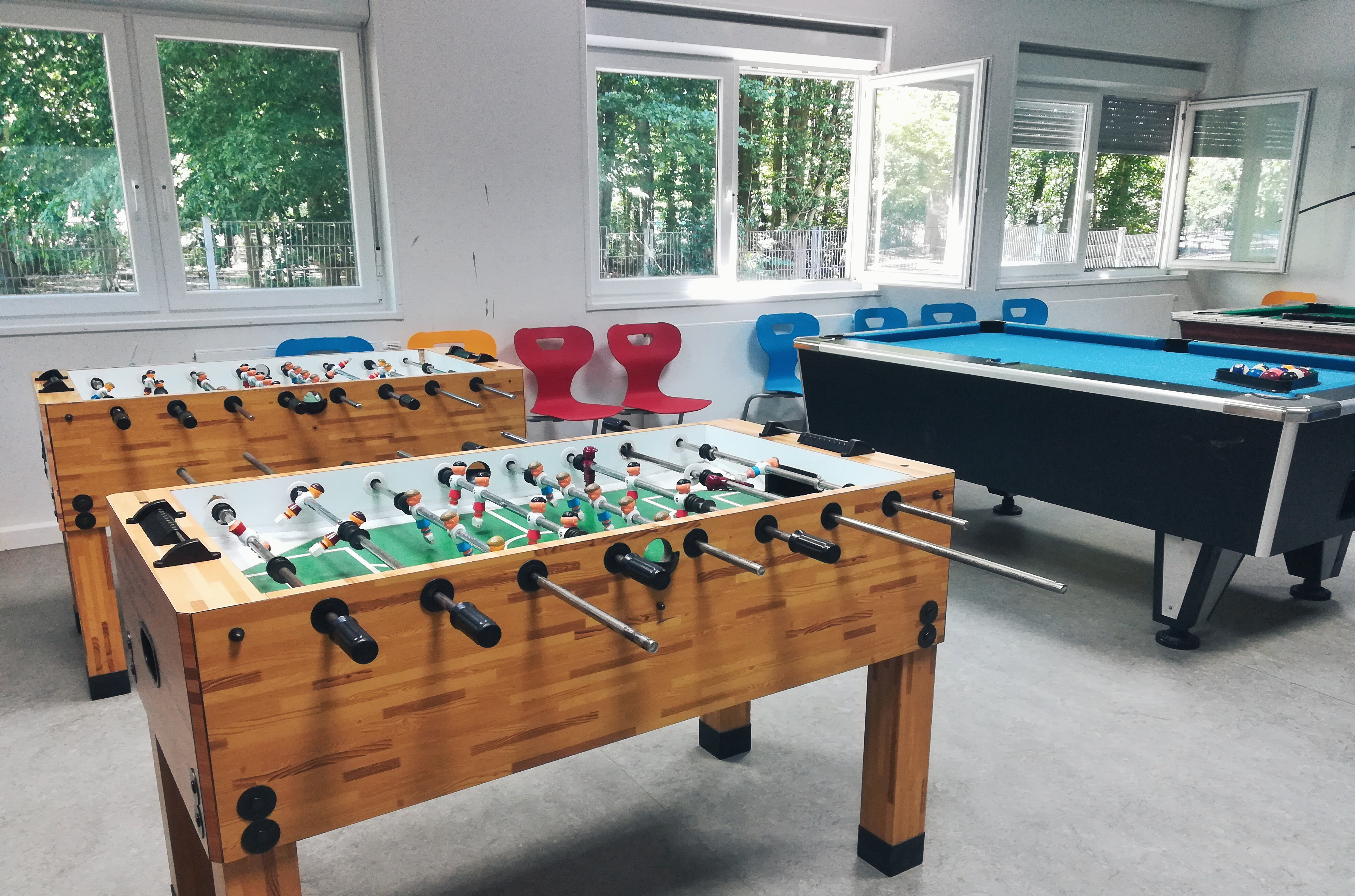 Im Ganztagscontainer stehen ein Billard- und 3 Kickertische und es gibt die Möglichkeit Carrom zu spielen.