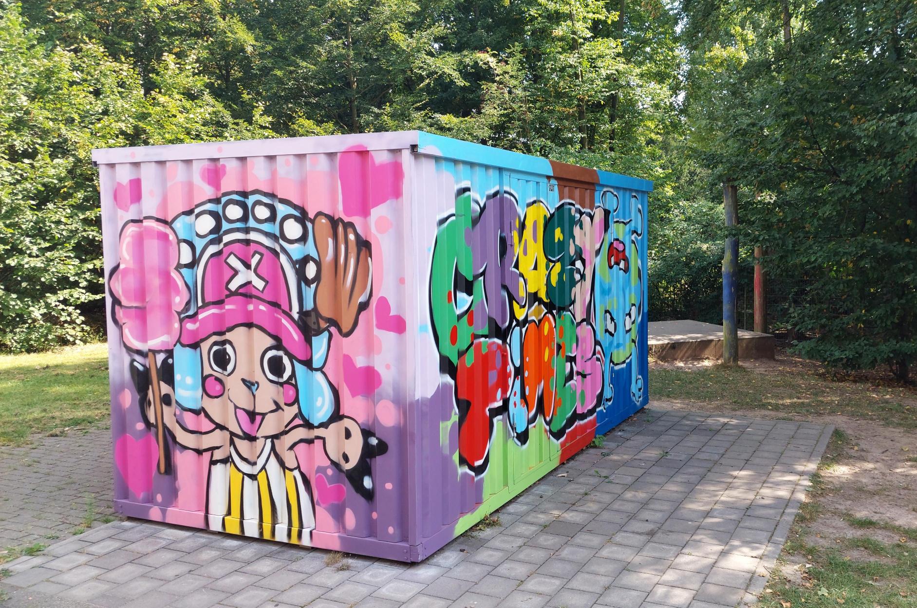 Beim Spielecontainer auf dem Schulhof können diverse Spiel- und Sportgeräte ausgeliehen werden.